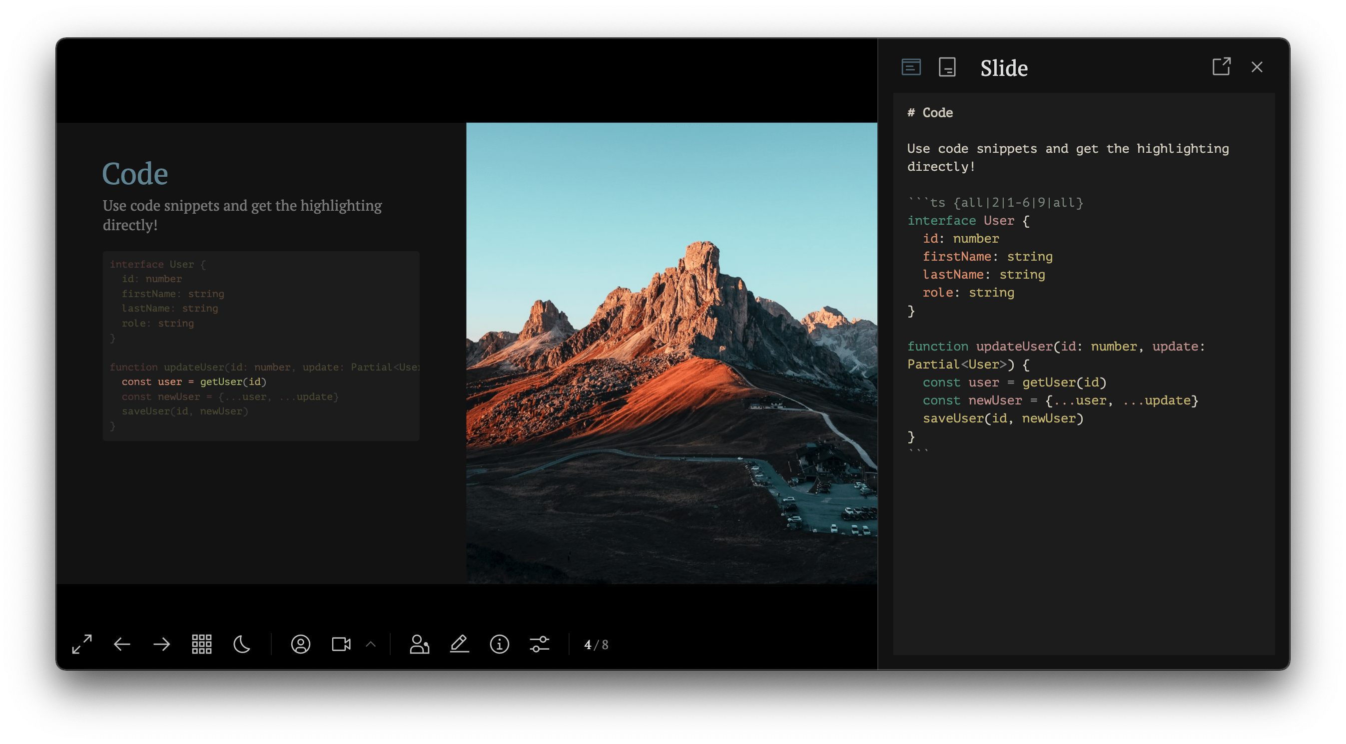 Slidev には統合エディターが付属しており、ファイルへの変更を即座にリロードして保存します。